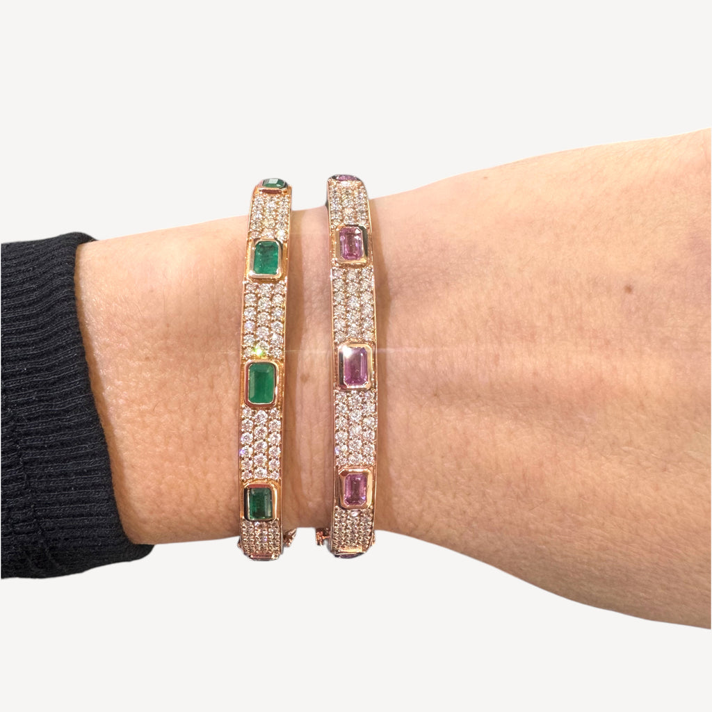 Bracelet rigide en or rose 750/1000eme serti demi tour de 86 diamants pour 1ct41 et de 5 saphirs rose taille émeraude pour 1ct55.