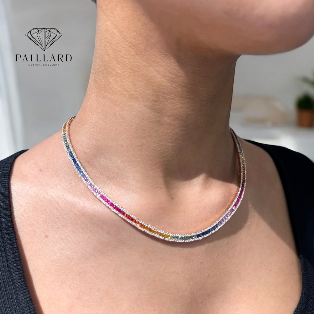 Collier en or rose 750/1000ème serti de 195 saphirs rainbow pour 17cts35 et de 4cts de diamants taille brillants fermoir cliquet et sécurité.