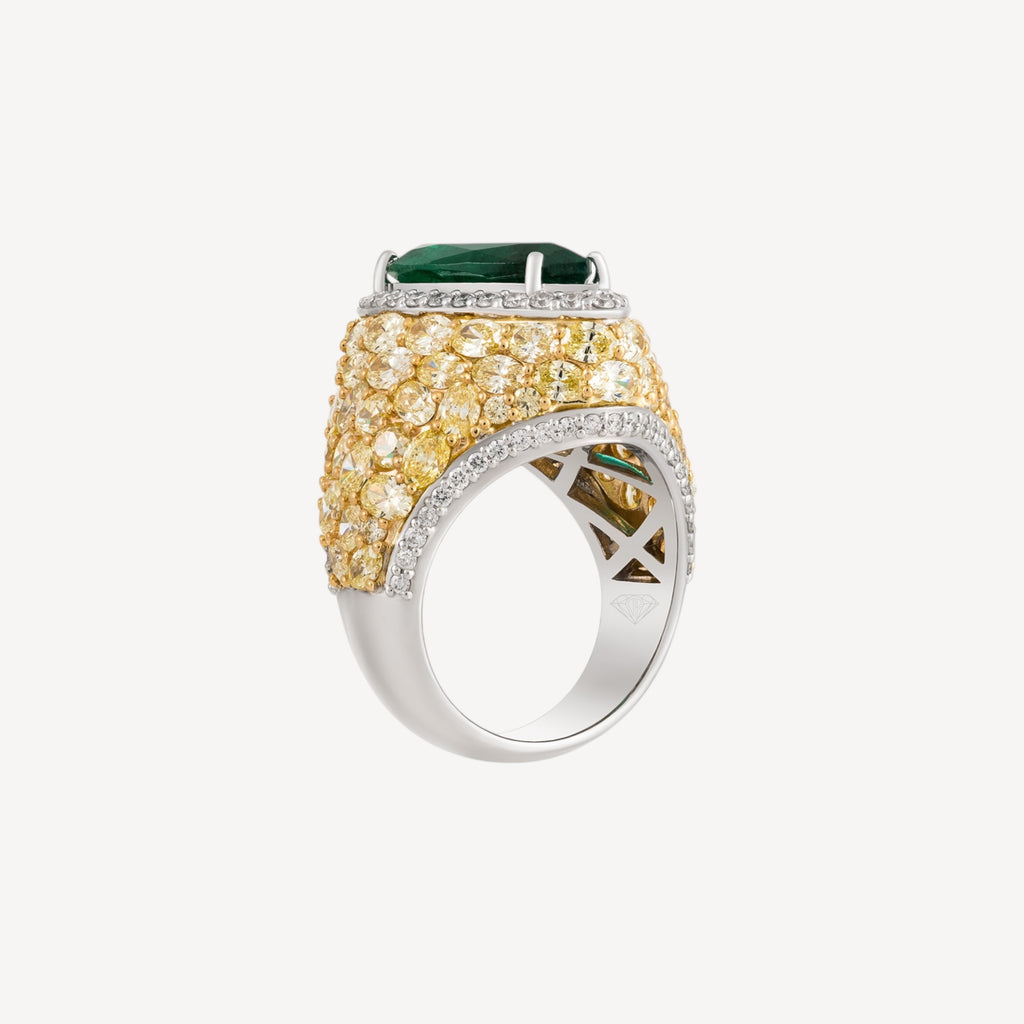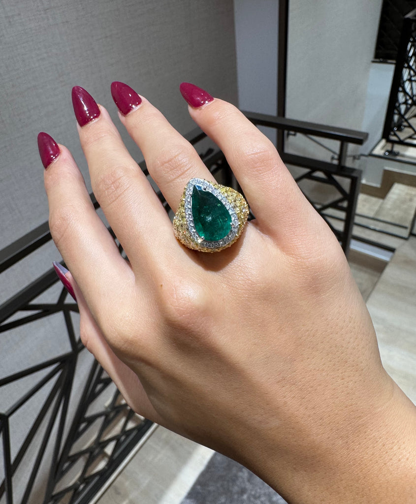 Bague en or jaune 750/1000ème sertie d’une émeraude centrale taille poire de 4cts27, sertie de diamants 78 diamants blancs 0ct78, de 66 diamants ovales fancy yellow pour 5cts22 14diamants fancy yellow 0ct21.