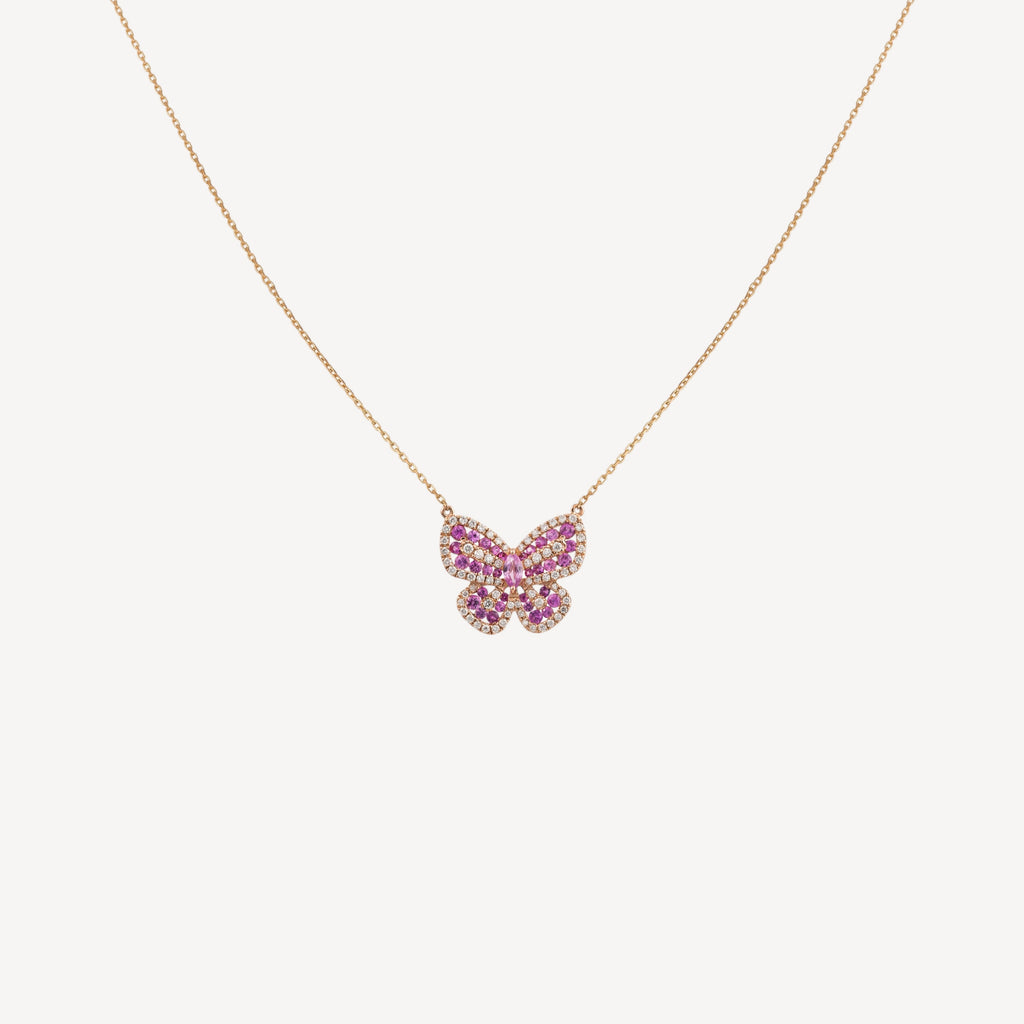 Collier en or rose 750/1000ème papillon serti de 33 saphirs roses 0ct89 et de 68 diamants 0ct37.