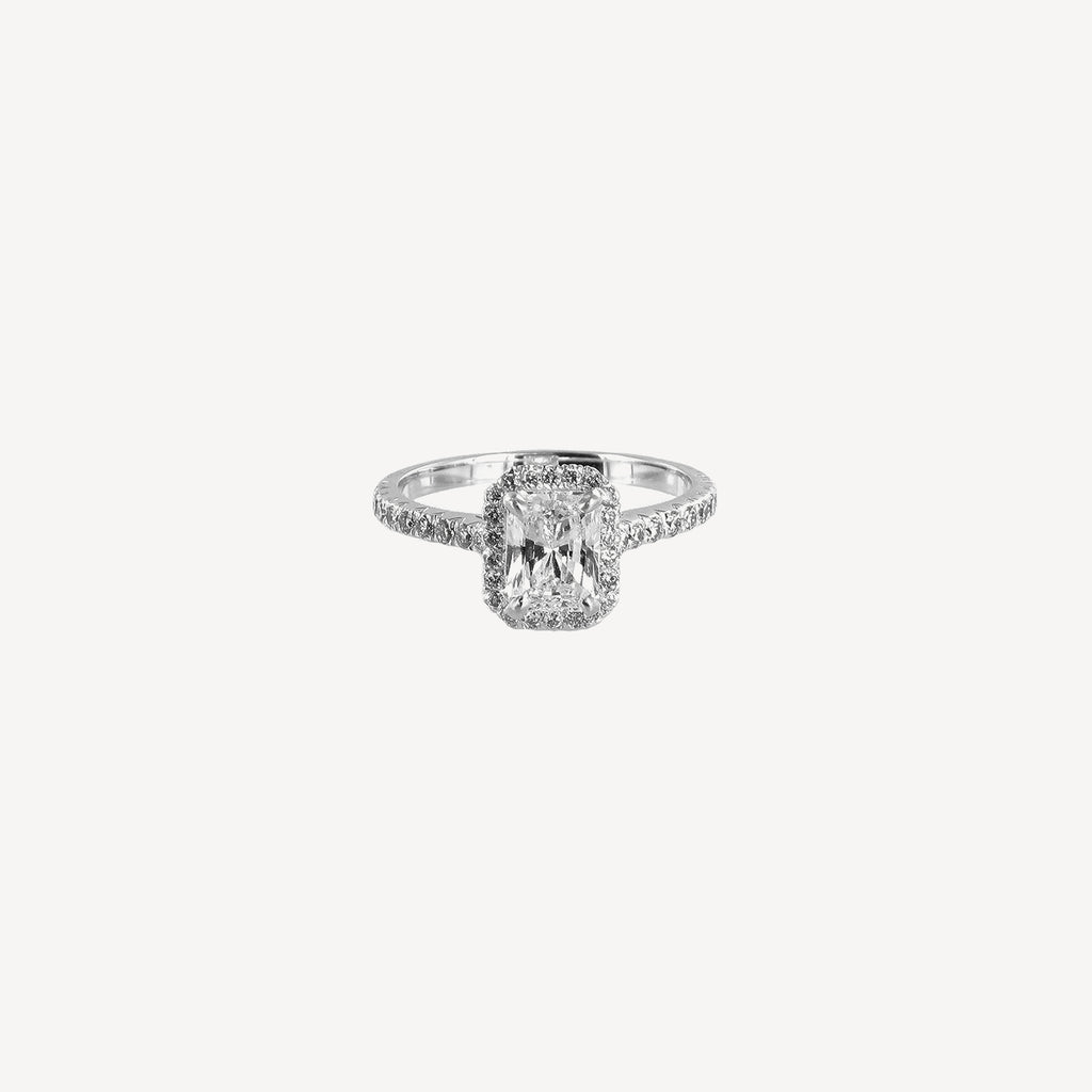 Solitaire en or blanc 750/1000ème serti d'un diamant taille émeraude de 0ct90 entourage et corps de bague serti de 0ct30 de diamants taille brillants.
