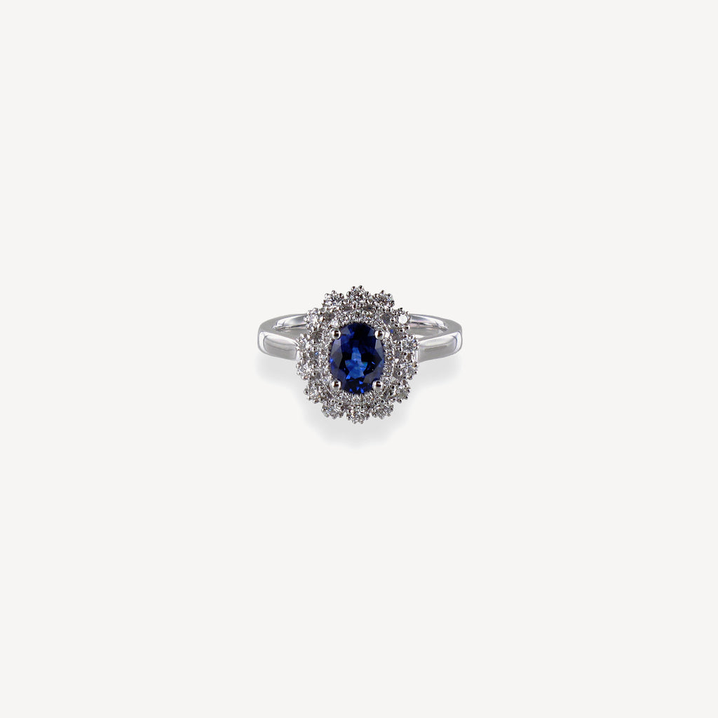 Bague en or blanc 750/1000ème sertie d'un saphir oval de 0ct83 et de 34 diamants 0ct33.